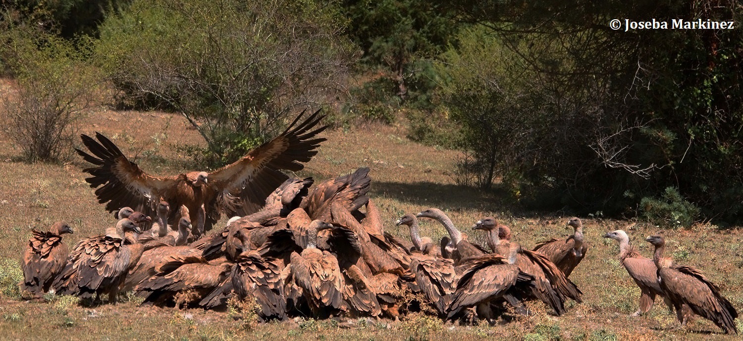 En la imagen de portada observamos un numeroso grupo de Buitres leonados alimentándose de una res muerta en la localidad alavesa de Sobrón. En el Territorio Histórico de Álava tenemos la gran fortuna de disfrutar de las cuatro especies de buitres que pueblan Europa. No obstante, la presencia del Buitre negro y del Quebrantahuesos es esporádica y la situación del Alimoche es bastante precaria.