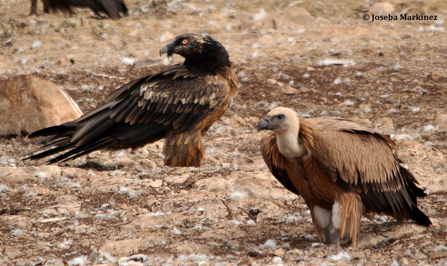 Inmaduro de Quebrantahuesos y juvenil de Buitre leonado en un muladar gestionado por la Generalitat catalana en Boumort (Lleida)